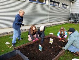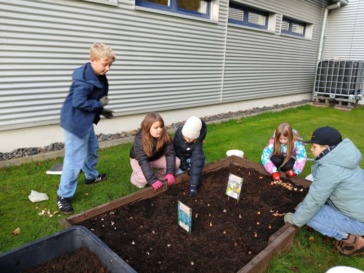 Eine Delegation aus „Zwiebelsetz-Spezialisten“ aus unserer 4d setzte am vergangenen Donnerstag, dem 13.11.25, eine Auswahl von Blumenzwiebeln in unsere Beete: Narzissen, Traubenhyazinthen, Ranunculus, Sparaxis und Iris. Wir hoffen, dass von März bis Juni eine bunte Blumenpracht unseren Schulgarten verschönert 😊