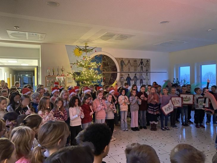 Am Freitag vor dem ersten Advent haben wir in der Overbergschule die Weihnachtszeit eingeläutet. Tags zuvor war von unserem Hausmeister schon der große Weihnachtsbaum aufgestellt und liebevoll geschmückt worden, so dass die Vorfreude auf Weihnachten merklich stieg. Auch weihnachtliche Klänge schwebten während der letzten Zeit immer wieder durchs Schulhaus, wenn fleißig geprobt wurde.