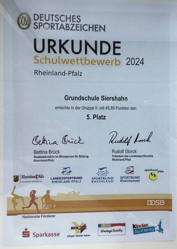 Stolze 134 Kinder der Grundschule Siershahn konnten 2024 ihr Sportabzeichen ablegen und haben dabei großen Ehrgeiz und erfreuliche Leistungen in verschiedenen Disziplinen gezeigt. Der Lohn für diese Anstrengungen ist ein 5. Platz der Overbergschule in der Gruppe der rheinland-pfälzischen Schulen zwischen 151 und 300 Schülern. Die Urkunde überreichte die Präsidentin des Deutschen Sportbundes Frau Monika Sauer am 28. August unseren beiden stellvertretend bei der Verleihung anwesenden Sportlehrerinnen Frau Wichert und Frau Hartmann.