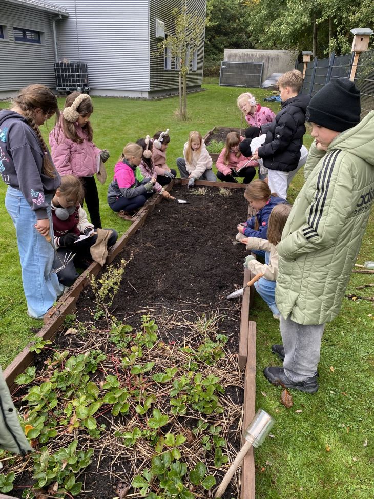 Am letzten Schultag vor den Herbstferien haben wir unseren Garten winterfest gemacht und für den Frühling vorgesorgt. Zuerst haben wir die alten Gemüsepflanzen herausgezogen, die letzten Möhren geerntet und Unkraut gejätet. Dann haben wir den Boden aufgelockert. Jetzt war er bereit für die Blumenzwiebeln, die wir pflanzen wollen: Tulpen, Narzissen, Traubenhyazinthen, Krokusse und Anemonen. Zuerst haben wir auf den Pflanzenkarten nachgelesen, wann die Blumen blühen werden und geschaut, wie tief und in welchem Abstand die Zwiebeln in den Boden gesetzt werden müssen. Das war gar nicht so leicht zu erkennen. Dann ging es los mit dem Graben. Dabei haben wir ganz schön viele Maden entdeckt! Puh, das war für einige ganz schön eklig…