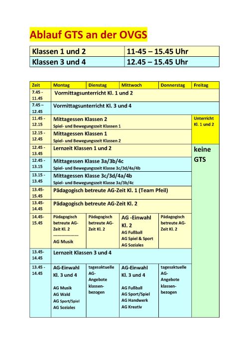 Die Ganztagsschule deckt von Montag bis Donnerstag die Zeit von 7:45 Uhr bis 15:45 Uhr ab. Freitags gibt es kein Ganztagsangebot.