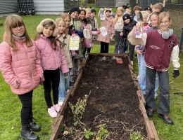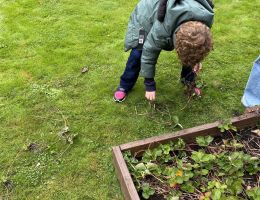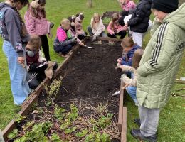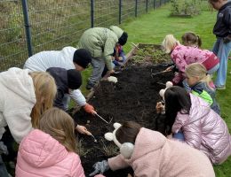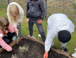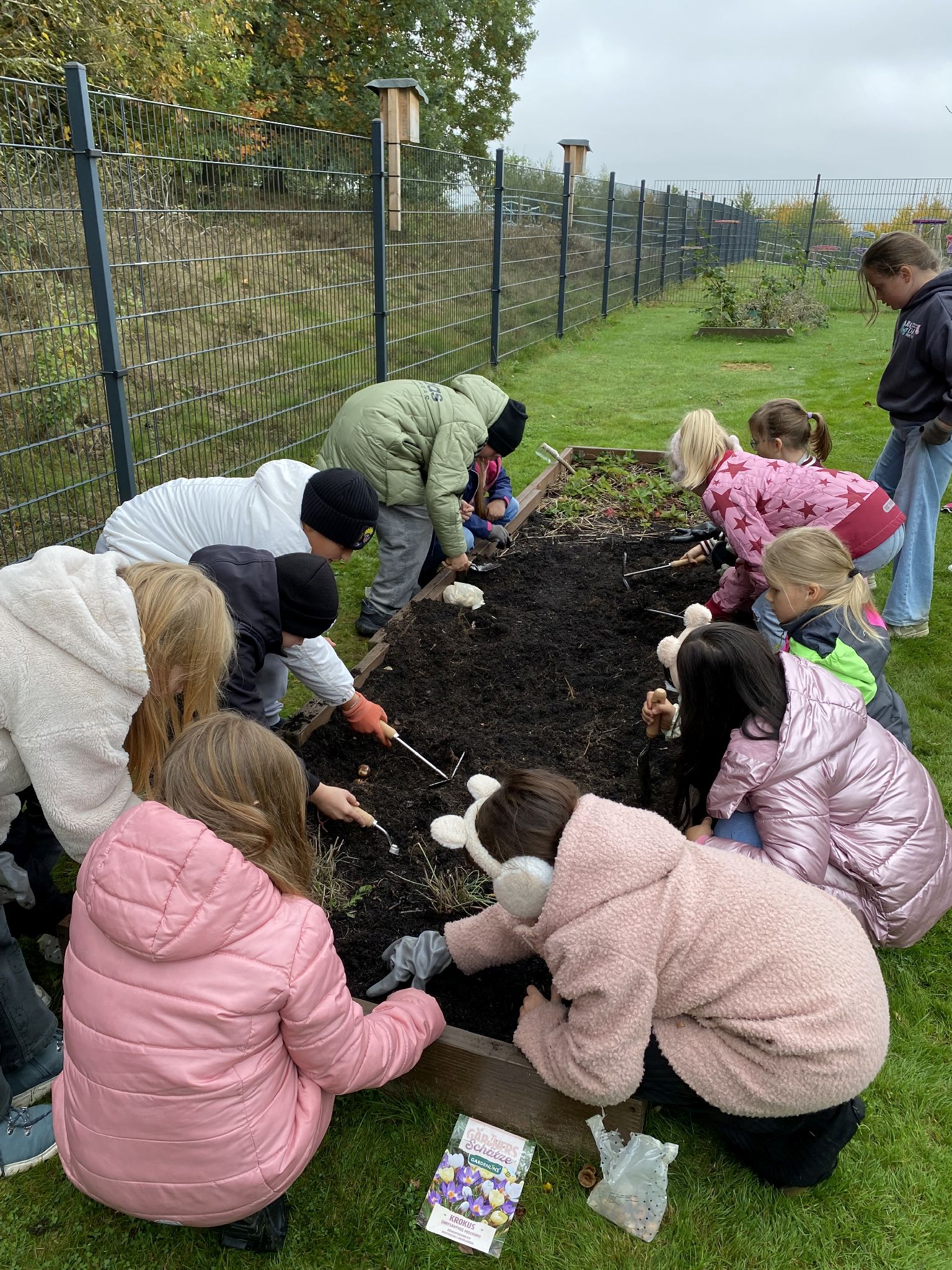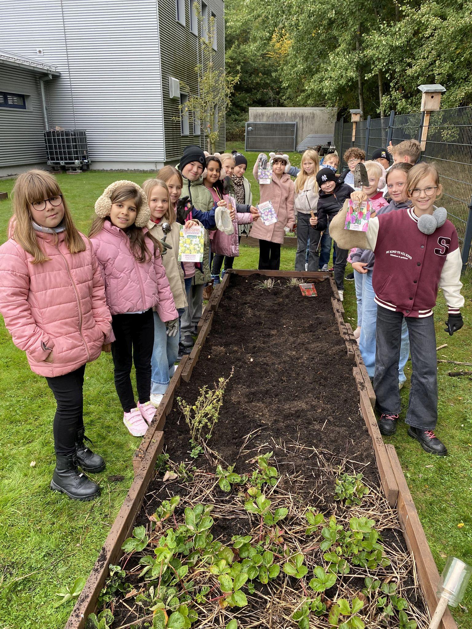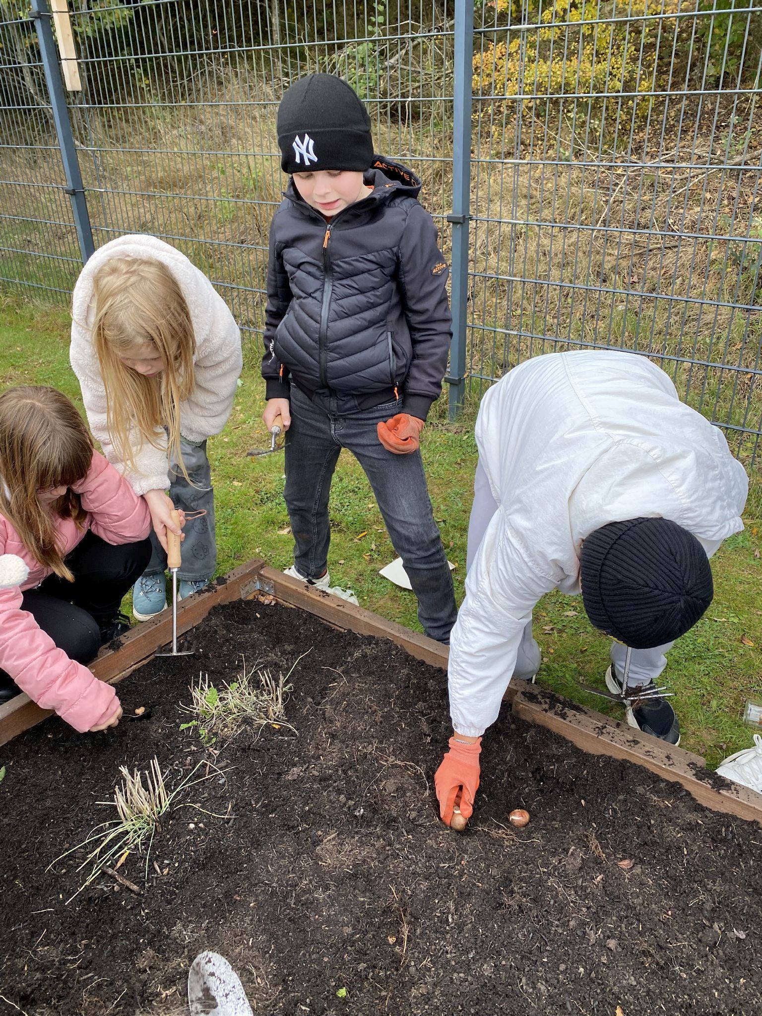 Am letzten Schultag vor den Herbstferien haben wir unseren Garten winterfest gemacht und für den Frühling vorgesorgt. Zuerst haben wir die alten Gemüsepflanzen herausgezogen, die letzten Möhren geerntet und Unkraut gejätet. Dann haben wir den Boden aufgelockert. Jetzt war er bereit für die Blumenzwiebeln, die wir pflanzen wollen: Tulpen, Narzissen, Traubenhyazinthen, Krokusse und Anemonen. Zuerst haben wir auf den Pflanzenkarten nachgelesen, wann die Blumen blühen werden und geschaut, wie tief und in welchem Abstand die Zwiebeln in den Boden gesetzt werden müssen. Das war gar nicht so leicht zu erkennen. Dann ging es los mit dem Graben. Dabei haben wir ganz schön viele Maden entdeckt! Puh, das war für einige ganz schön eklig…