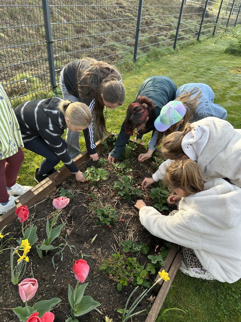 Ach ja, und noch einen ganz wichtige Arbeit stand im Schulgarten heute noch an: Um die Erdbeerpflanzen haben die Kinder rot bemalte Kieselsteine verteilt. Diese sollen helfen, die Vögel von den später reifenden Erdbeeren fernzuhalten. Wir sind gespannt, ob es funktioniert!!